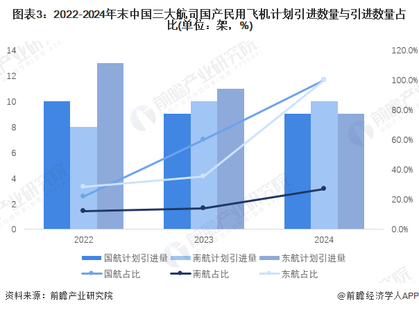 从机队引进计划方面来看,根据我国三大民航龙头企业2021年的年报,在2022-2024年的机队引进计划中,中国商飞系的客机引进量占比在不断提高。