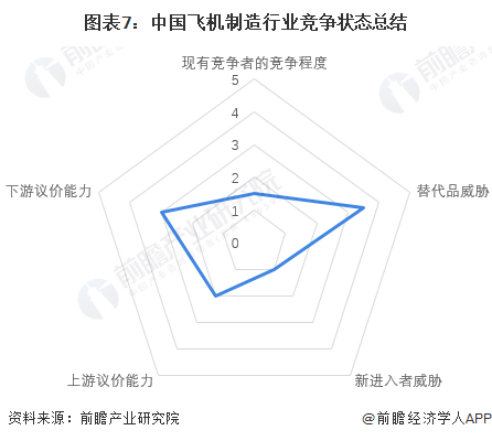 从波特五力模型角度分析,对于目前我国的飞机制造行业而言,由于极高的技术、资金、资质等壁垒的存在,行业的现有竞争程度、新进入者的威胁以及上游的一家能力都相对较低。在替代品威胁方面,由于国内高铁的的快速发展,表现出了对民航运输的极大替代性。