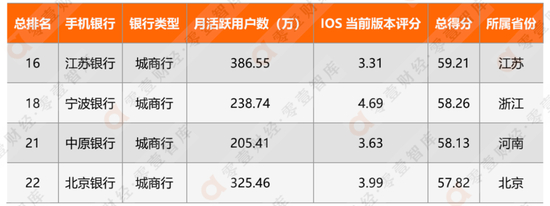 表 1:4家头部城商行手机银行综合排名结果