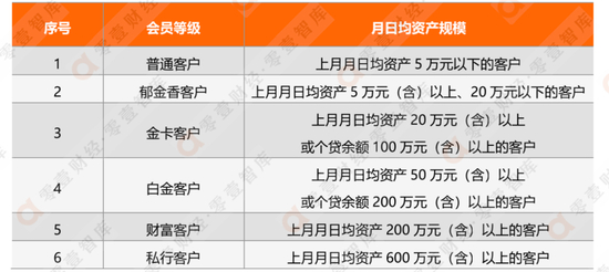 在会员等级设置上,北京银行共有6个层级,划分依据主要是上月月日均资产,资产包括本外币储蓄存款、国债、理财、基金、保险、私行代销、三方存管。需要指出的是,北京银行是四家城商行之中,唯一采用“个贷余额口径”的会员等级评定银行。