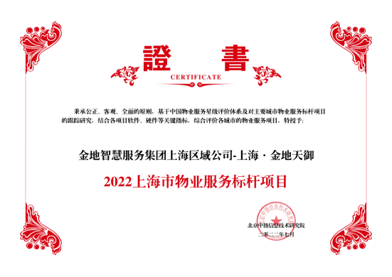 金地物业旗下上海金地天御凭借良好的服务水平,获得“2022上海市物业服务标杆项目”及“2022五星级物业服务项目”殊荣。