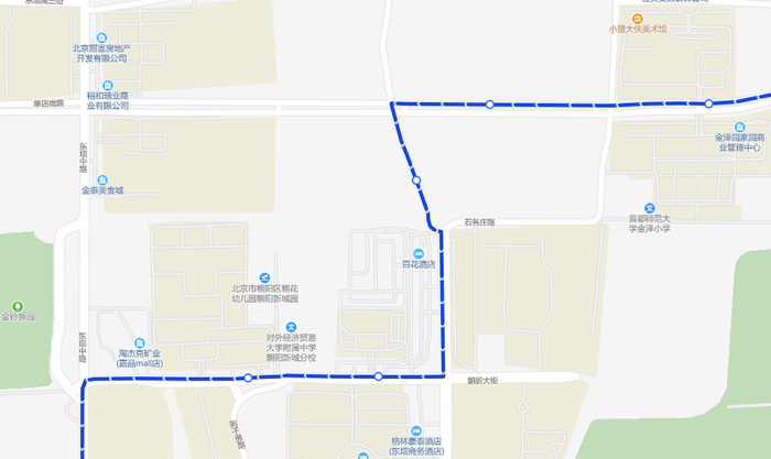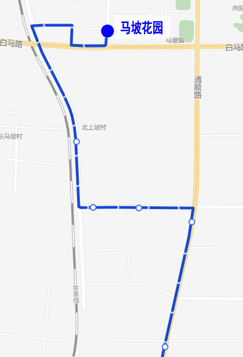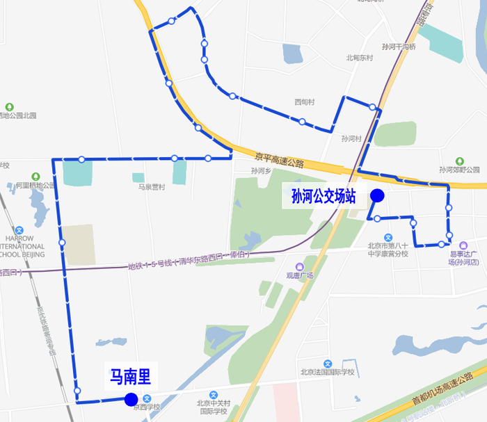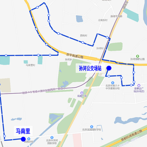 孙河公交场站、兴苇北街西口、康瑞路北站、香苇路、康清路北站、康清路北口、地铁孙河站(开往孙河公交场站方向)、地铁孙河站北、瑞悦府小区、中粮瑞府小区、瑞湾家园、首开琅樾小区、景汇路西口、香榆园、瑞榆东园、顺白路东口、瑞榆西园、顺白路东站、马泉营村西口、马泉营西路南口(开往马南里方向)、地铁马泉营站(开往孙河公交场站方向)、观唐东路(开往孙河公交场站方向)、马南里。