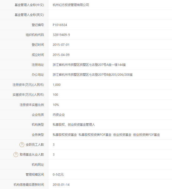 备案信息显示,杭州幻方成立于2015年4月,同年7月备案为股权创投基金管理人。注册资本1000万元,实缴比例10%。成立多年来,杭州幻方旗下仅有1只备案产品,管理规模不足5亿元。