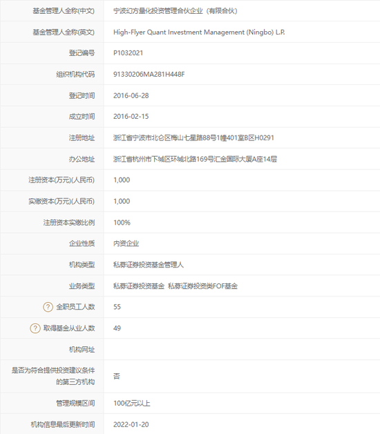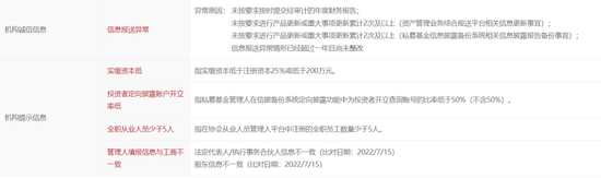 值得注意的是,杭州幻方现有一条诚信信息,为信息报送异常。另有四条提示信息:实缴资本低于注册资本25%或低于200万元;投资者定向披露账户开立率低于50%;全职从业人员少于5人(现为3名);管理人填报信息与工商不一致。