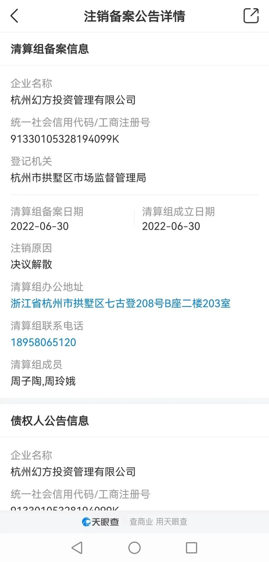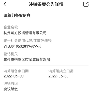 据这份显示来自天眼查的截图谢谢,杭州幻方投资管理有限公司(简称:杭州幻方)公告注销备案。