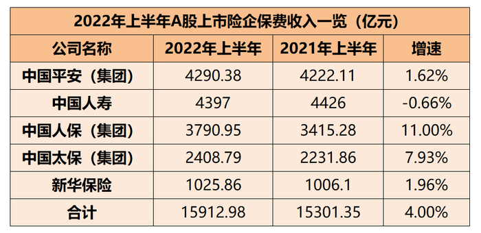 整体来看,今年上半年,A股五大上市险企合计实现保费收入1.59万亿元,同比增长4%。除中国人寿保费增速略有下滑外,其余4家均呈上升趋势,中国人保同比增速超10%。