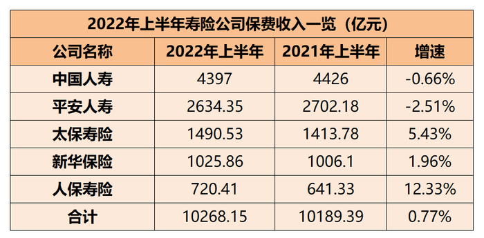 5家寿险公司上半年实现原保费收入1.03万亿元,同比增长0.77%。中国人寿、平安人寿、太保寿险、新华保险、人保寿险同比增速分别为-0.66%、-2.51%、5.43%、1.96%、12.33%。