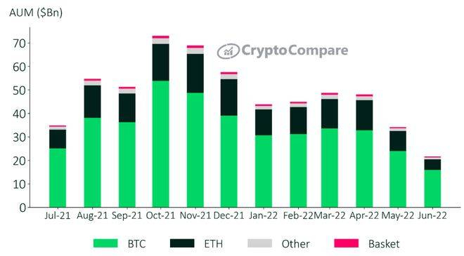 根据CryptoCompare 的数据,6 月份管理的比特币投资工具(AUM)总额为 159 亿美元。该指标包括交易所交易产品,例如灰度 GBTC 和来自多个提供商的交易所交易票据。这个比率相当于比特币当前 4 亿美元市值的 4%。