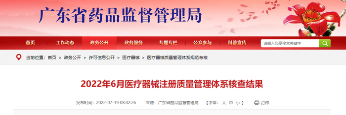广东省药品监督管理局公布2022年6月医疗器械注册质量管理体系核查结果