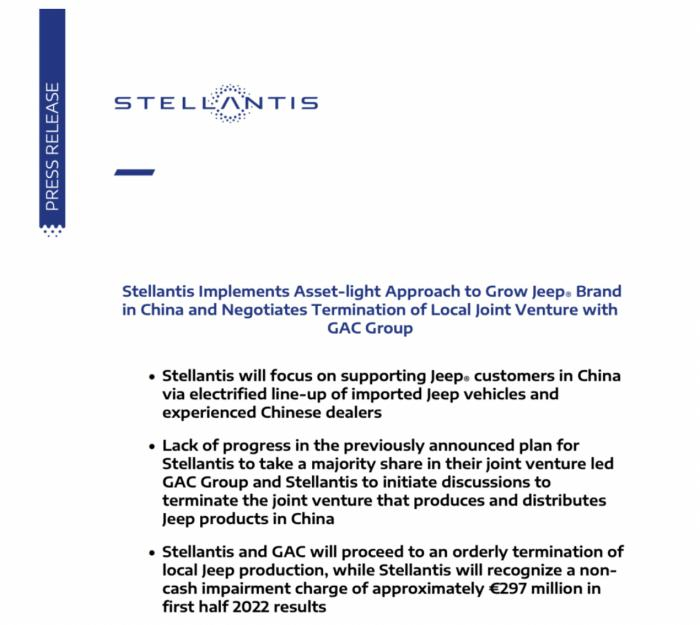 由于之前宣布的Stellantis获得与广汽集团合资企业广汽菲克多数股份的计划缺乏进展,Stellantis集团将采用轻资产方式在中国发展Jeep品牌,并与广汽集团协商终止本地合资企业,今后Stellantis将专注于在中国分销Jeep品牌的进口汽车,通过轻资产方式发挥Jeep品牌及其标志性产品的潜力并增强进口汽车的电气化阵容。