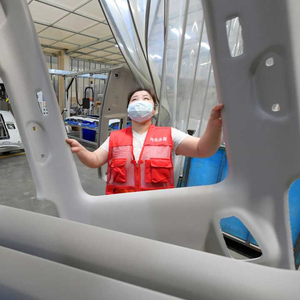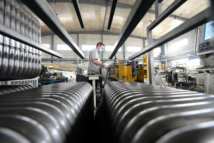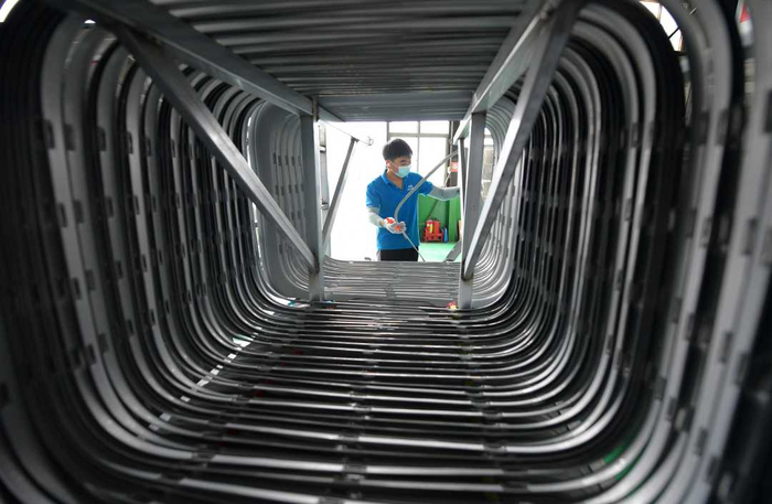 7月19日,在文安县新桥环保科技产业园兴隆金属制品有限公司,工人正在整理奔驰汽车天窗支架。