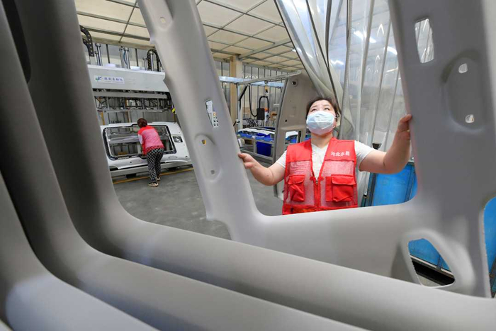 7月19日,在文安县永昌座椅有限公司,工人正在搬运汽车顶衬。