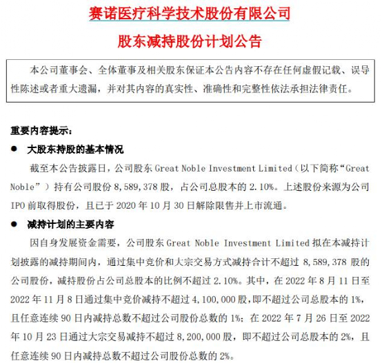 据统计,今年1月18日至7月16日,Great Noble通过集中竞价交易、大宗交易等方式减持了1940万股,减持总金额达到1.07亿元。此外还通过询价转让方式减持了赛诺医疗1640万股,其持股比例也直接降至目前的2.1%。