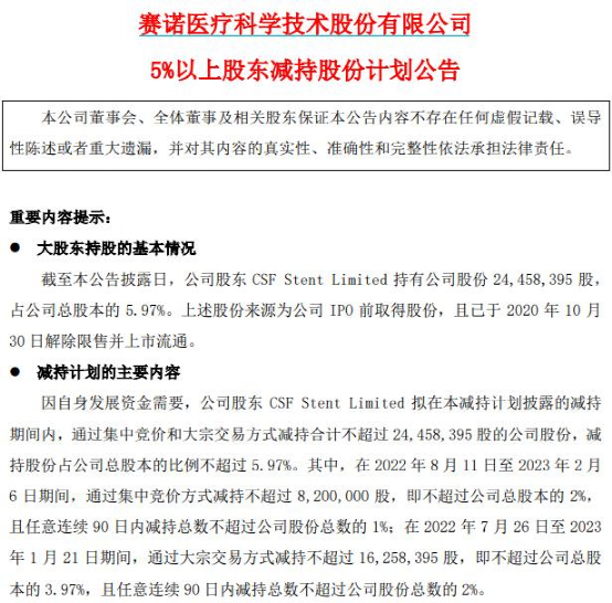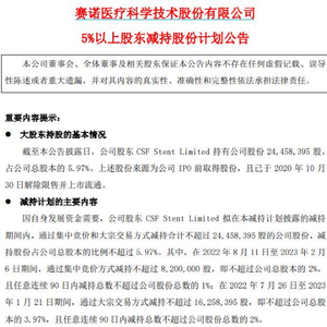 赛诺医疗公告显示,因自身发展资金需要,赛诺医疗股东CSF Stent Limited拟减持合计不超过2445.9万股公司股份,减持股份占公司总股本的比例不超过5.97%。