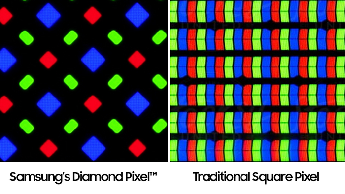 为了改进 PenTile 的问题,三星后续又推出了大名鼎鼎的钻石排列,它本质上依旧是增大子像素面积和共用临近像素的做法,但却把子像素的排列形状变成了菱形。