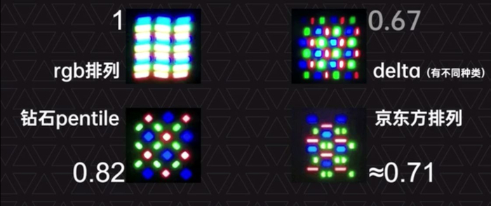 为了规避专利风险,国产屏没办法用更成熟的钻石排列,只能自己去从头研究三个子像素的排列组合。