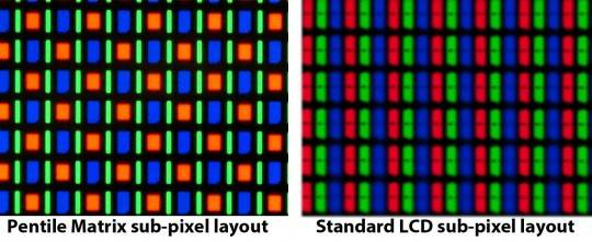 没错,专门做 OLED 屏幕的三星也是这么想的,搞出了 PenTile 排列,而为了保证红蓝子像素的寿命,就做大了子像素面积,但同时也减少了子像素的数量。