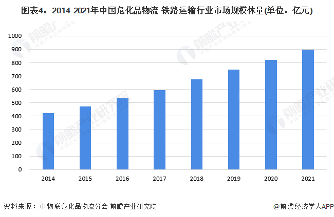 根据中物联危化品物流分会公布的数据,铁路运输占危化品运输方式的4%,因此可以初步统计,2021年我国危化品物流-铁路运输规模约900亿元。
