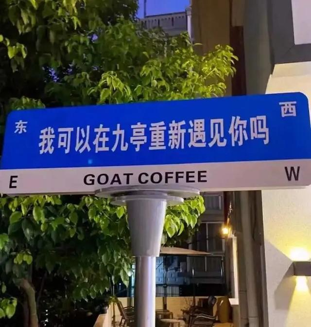 九亭一家咖啡店前,一块牌子写着:“我可以在九亭重新遇见你吗”,很受消费者欢迎。这块牌子是GOAT COFFEE(山羊咖啡)九亭大街店设置的,店员表示,“指示牌竖之前咨询了一下相关部门,说不能竖在人行道上,刚好店门口有一个小阳台,就竖在那里了。”店员还表示,有网友专门来打卡这块牌子,“不一定来买咖啡,就是来拍照。”