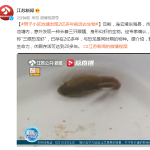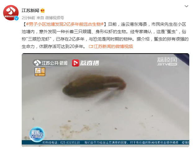 【#男子小区池塘发现2亿多年前远古生物#】日前,连云港东海县,市民宋先生在小区池塘内,意外发现一种长着三只眼睛、身形似虾的生物。经专家确认,这是"鲎虫",俗称"三眼恐龙虾",已存在2亿多年,与恐龙是同时期的物种。据介绍,鲎虫的卵有很强的生命力,休眠存活可达到20多年。