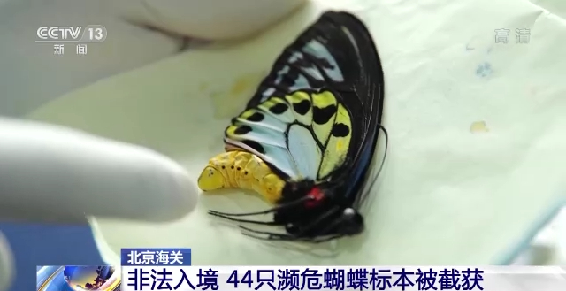 北京海关所属北京邮局海关印刷品监管科副科长 程铭嘉:首先它违反了华盛顿公约,这个蝴蝶它属于华盛顿公约附录Ⅱ的濒危物种,所以属于禁止进境的名录(中的物种),其次蝴蝶有可能在它的原产地区会携带有相关的疫病,所以我们在进境(查验)当中,所有有关动植物的进境都需要有关部门的检疫审批。