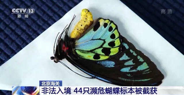 北京海关近日截获了44只大蝴蝶标本,经鉴定,这些蝴蝶是列入濒危物种红色目录Ⅱ的蓝鸟翼凤蝶。