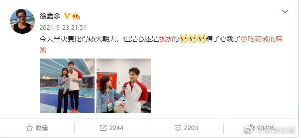 随后王冰冰和徐嘉余还有一段长时间的采访过程,徐嘉余一直强调只要有王冰冰在现场看他比赛,他就会比较有动力,还直接说希望可以和冰冰姐有很多互动,采访结束之后两人进行了合影。后来在一次正式比赛结束之后,徐嘉余也被其他媒体记者调侃过:“你的心还是冰冰的吗?”徐嘉余还是毫不犹豫就说“是的”,说的时候还脸带笑容。