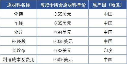 举个例子:中国某制造商生产庭院用伞(HS 6601.10)出口至新加坡,伞的FOB价为每把5.3美元,生产工序均在中国完成。庭院用伞原材料情况如下: