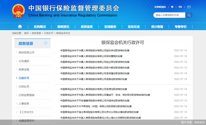 7月18日,银保监会发布行政许可信息显示,核准李源天安人寿总经理的任职资格。另外五则批复关于华夏人寿,包括核准赵松来华夏人寿总经理、赵立军华夏人寿董事、田今朝华夏人寿总精算师、李路华夏人寿监事、李英建华夏人寿副总经理的任职资格。