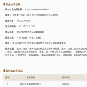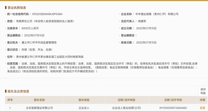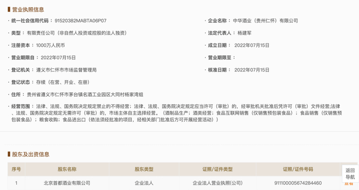国家企业信用信息公示系统(贵州)官网信息显示,首都酒业在仁怀市茅台镇成立两家全资子公司——中华酒业和中华酒业销售(贵州仁怀)有限公司,注册资本分别为1000万元和5000万元,均由首都酒业100%控股。