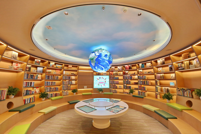 长风馆的还书系统、自动分拣系统和消毒设施也是世界领先的,这些专业化的设施,也都透明化地展示在孩子面前,成为科学展示的一部分。长风馆项目主创设计师,上海建筑设计研究院有限公司建筑三院院长助理及总师助理严赉赟特别提到一个设计亮点:馆内图书自动分拣系统选择了国外先进的机械化还书装置。“我们设计时将其从台后移到了台前,设置在观光电梯内,让孩子们上下电梯时能看到自走小车的运输轨迹,既真实有趣,也起到了教育作用。”