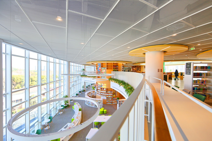 馆内拥有开放式的内部动线,呈现有趣而复合化的阅读空间。馆内分布着大小不同、高低起伏的圆形书架,结合入口的“智慧树”门厅、通高中庭与螺旋楼梯,形成了阅读的“森林”。根据不同年龄段的需求,各层公共空间设置有各类阶梯式阅读交流空间,在屋顶则打造了充满童趣的儿童乐园。沿着阶梯拾级而上,整个过程犹如从大地走向天空一般,朝着知识的殿堂步步迈进。