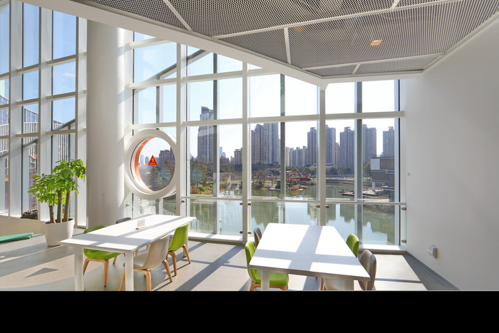 “建在水边的图书馆世界少有。” 严赉赟说,长风馆不仅有丰富的藏书和儿童设施,其建筑本身也是一道风景线。长风馆位于苏州河畔,馆外就是一个优美的人工湖。抓住地利优势,设计团队围绕人工湖的水岸线勾勒出一个环形的建筑,形成一种拥抱感;并且在建筑和湖面之间打造亲水的台阶和平台,在阅读的同时,读者也能到室外亲近自然。
