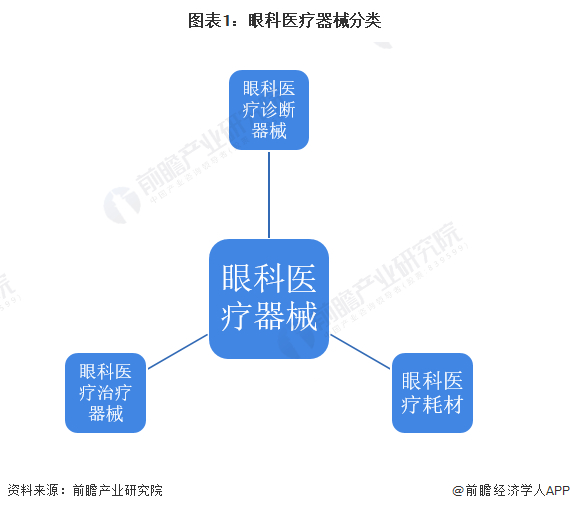 眼科医疗器械包括用于诊断和治疗眼科疾病的眼科设备及相关仪器、辅助器械和植入物,可分为眼科耗材、眼科诊断设备及眼科治疗设备。一般来说,眼科医疗器械及眼科医疗器械市场不包括隐形眼镜及护理液。