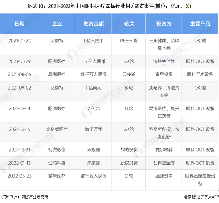 伴随着我国各项眼健康政策的出台和眼科治疗市场需求的不断上升,我国眼科医疗器械融资市场的热度也在不断上升。2021年以来,我国共有眼科医疗器械相关融资事件9起,其中眼科影像设备等眼科诊断设备是最热门的产品领域。