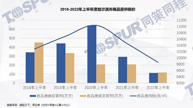 据同策同程数据显示,2022年上半年哈尔滨商品房供应111.6万㎡,同比下降62%,成交116.6万㎡,同比下降44%。