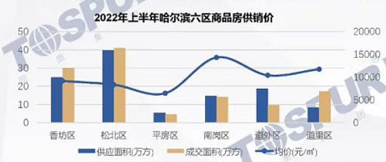 从主城六区供销价情况来看,全市冷热不均,南岗价格坚挺,道里去库存,松北、香坊仍是成交主力。