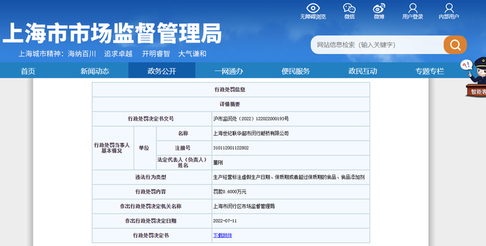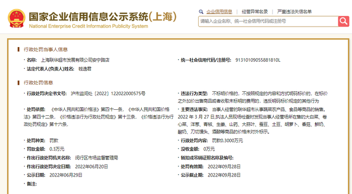 值得一提的是,不久前,6月16日,上海世纪联华西部商业有限公司中环路店因生产经营标注虚假生产日期、保质期或者超过保质期的食品、食品添加剂,被上海市普陀区市场监督管理局罚款2万元。6月20日,上海联华超市发展有限公司安宁路店因违反价格法,被闵行区市场监督管理局罚款3000元。