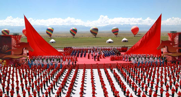 开幕式上“万马奔腾”表演尤为震撼,来自10个乡镇、2个马场的10300匹马驰骋在草原上,数百名骑手争相展示高超的赛马技术。开幕式文艺汇演由《马蹄吹趁月明归》《春风得意马蹄疾》《信马悠悠野兴长》《天马浩气展虹霓》等部分组成,《汉武帝赐天马》《戍边巡边》《云浴草原》《骏马赞》等节目,叼羊、姑娘追等表演,以及名马展示环节等呈现了昭苏悠久的马文化。