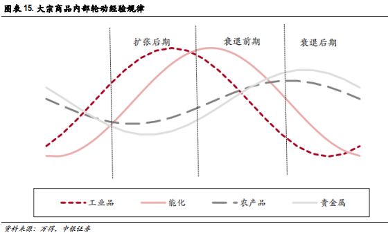 基于以上周期定位及我们在商品系列一、二中提出的商品轮动经验规律,短周期商品价格中枢见顶后,各品类商品与经济周期拐点顺序一般为:工业品->能化品≈经济周期->贵金属/农产品。当前时点配置上: