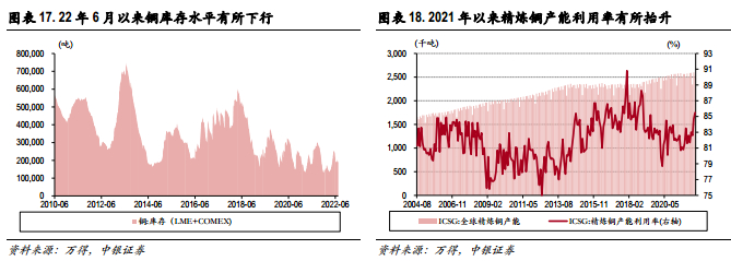 需求先导指标已出现走弱趋势,工业品价格下行压力凸显。工业品价格主要与需求强相关。2020年以来的新一轮中周期,作为传统资源品的精炼铜产能扩张有限,面对疫情过后快速修复的需求,铜的产能利用率也在去年开始出现了阶段性抬升的情况。当前,海外需求先导指标已经转弱,预示着下半年衰退风险增加,工业品里面与传统需求相关的铜价有望率先迎来拐点。2021年下半年以来,随着联储TAPER进程开启,铜价随即进入了高位震荡,我们看到当前铜价与基本面表征指标已经出现了近半年的背离,上一次类似的情形还是出现在2011年。本轮与2011年都处于危机后大放水导致的持续高通胀环境之中,往后看,随着需求的走弱,高通胀难以为继,货币紧缩减弱大宗商品金融属性,需求强相关的工业品价格也将重回下行趋势。相较之下,具有新兴产业需求增量的部分新能源金属本轮价格韧性明显更强。正如前文所述,新旧产业更迭的大背景下,新兴主导产业供需缺口优于传统产业,对应的金属价格在需求下行周期中有望展现出更强的超额收益。