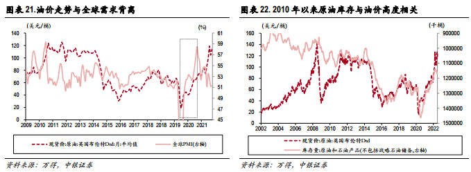 短期韧性犹在,衰退周期开启制约上行空间。相较工业品,供给对于能化品的价格影响更为显著。当前来看, OPEC产能尚处于疫情冲击以来的低点, 根据EIA的预计,2022年6月起产能有望逐步增加;从原油产量数据中我们也能看到,当前原油产量绝对值距离疫情前水平仍存在一定距离。本轮疫情爆发到2021年末(扩张前期-扩张后期),需求主导油价触底回升;2022年起,海外进入衰退前期,疫情因素叠加俄乌冲突加剧导致供给恢复缓慢,短期的供需缺口导致油价持续高位。此外,我们看到,2010年以来全球油价与库存的相关性显著提升。当前原油库存自4月末以来已经出现了触底回升的迹象,而短期油价与库存水平出现了一定程度的背离。往后看,随着需求下行持续,供需缺口有望逐步趋于弥合,油价高位难以为继;但预期转弱初期,供给的短缺或使得油价体现出一定韧性。