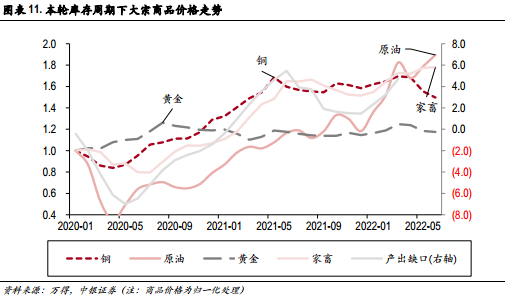 本轮库存周期,大宗商品价格演绎了我们所提出的经典轮动行情:工业品价格在2021年5月率先达到高点,此后进入高位震荡,截至2022年6月,铜价距离周期高点回撤12%,上行周期最大涨幅102%;相较之下,原油、农产品价格趋势拐点仍需等待,截至当前累积涨幅分别达到455%/124%;贵金属价格体现出逆周期的属性,疫情冲击阶段逆势上行26%。从第一库存周期下商品价格运行的经验规律来看,进入下行周期后各品类商品价格的回落在所难免。