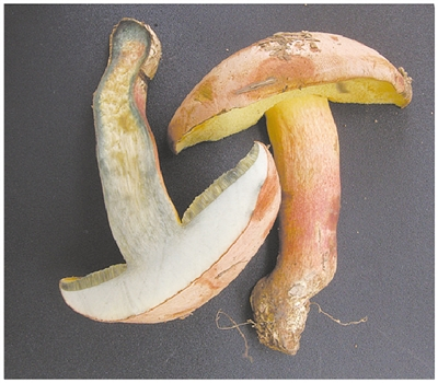 让普大姐夫妇“中招”的见手青,民间亦称“红葱”“红见手”,菌盖、菌杆受到机械损伤后,会缓慢变成淡蓝色至浅蓝色。