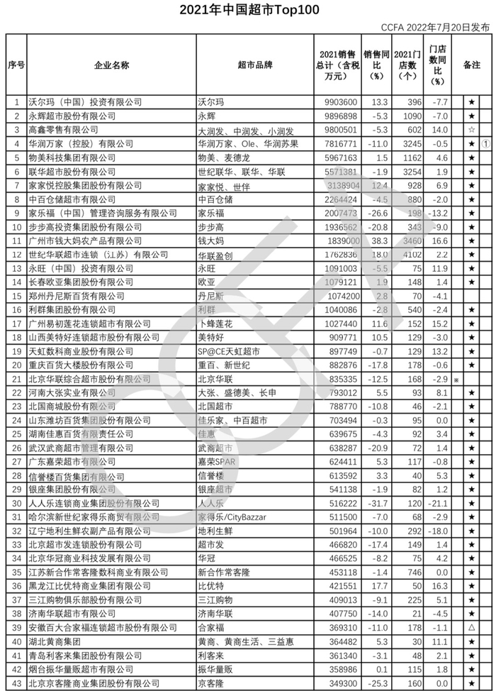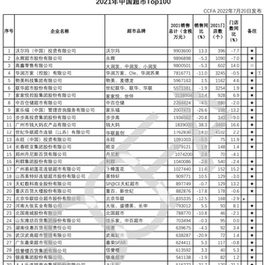 7月20日,根据2021年度超市行业经营情况调查结果,中国连锁经营协会发布“2021年中国超市Top100”。其中,沃尔玛、永辉、大润发(中润发、小润发)3个超市品牌名列前三。根据公告,2021年中国超市Top100线上销售同比增长四成。