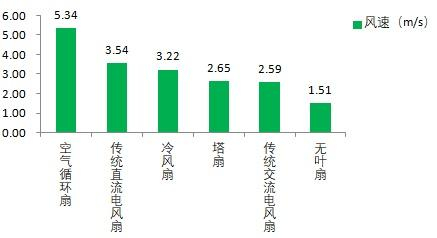 风速测试是电风扇吹力的大小,消费者站在风扇前就能最直观的感受到。空气循环扇有风筒风道的设计,聚风效果好,风速最高。而无叶风扇吹得相对柔和得多。