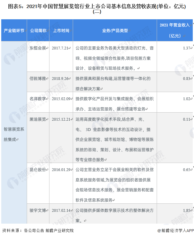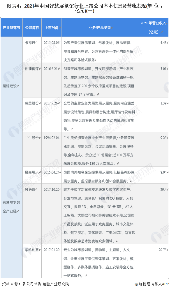 目前,我国以智慧展览馆相关行业为主营业务企业较少,其中A股上市企业有兰生股份、易尚展示、风语筑、华凯创意、米奥会展等。