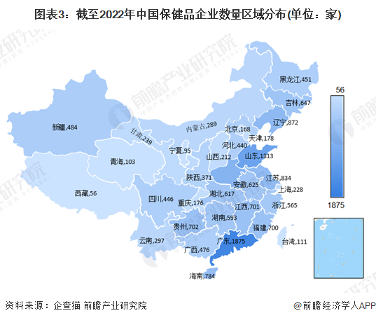 根据中国企业数据库企查猫,目前中国保健品企业主要分布在华南和华东等地,特别以广东和山东为代表。截至2022年6月底,广东共有相关保健品企业数1875家,山东则有1313家。