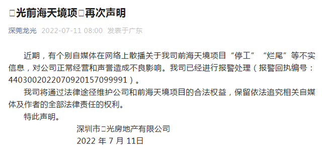 2022年7月10日,龙光在公众号上对备受关注的前海天境项目停工传闻进行了公开回应。