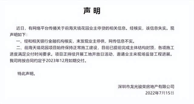 龙光在这份《龙光前海天境项目声明》中称,前海天境项目保持正常施工建设,已经完成主体结构封顶。为确保项目按时保质交付,龙光积极与业主、政府监管部门、金融机构等方面沟通协商,制定各施工阶段的详细的保交楼方案。